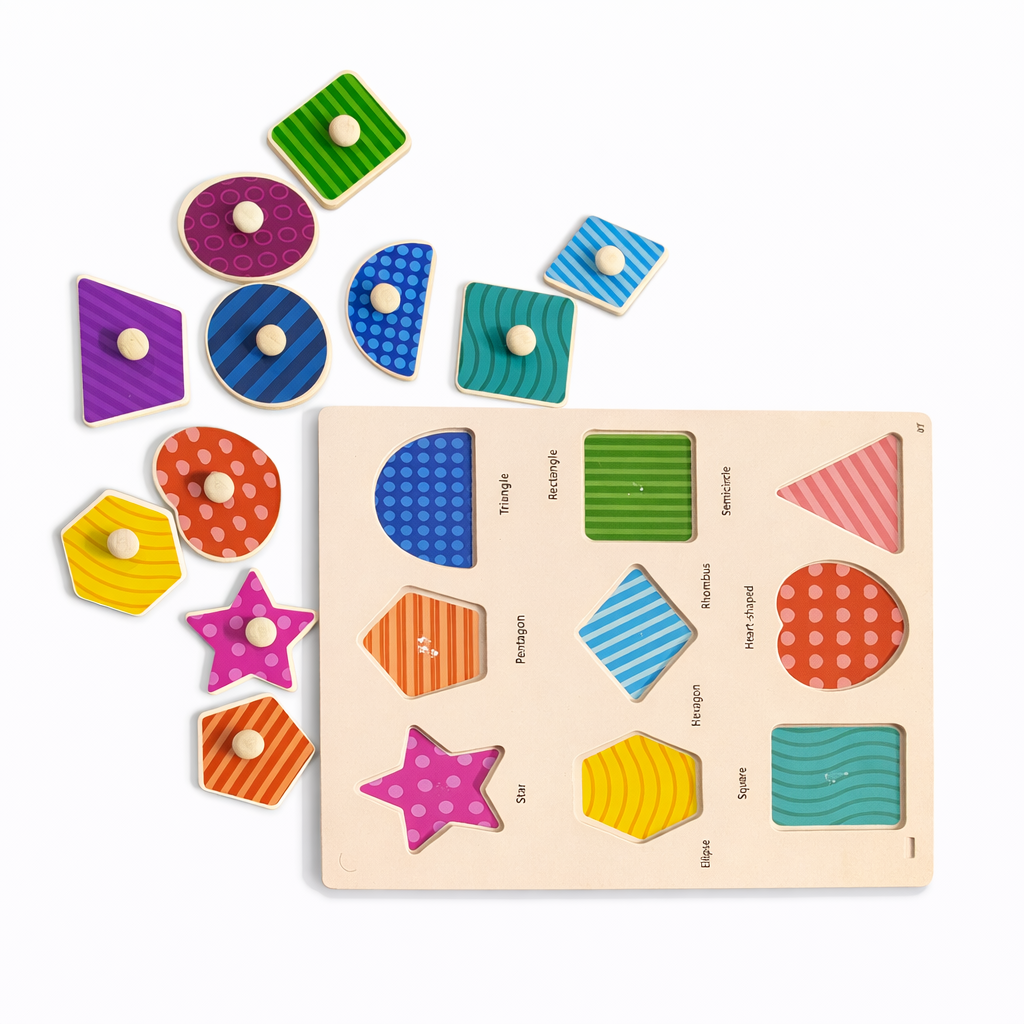 এই puzzle board–এ রয়েছে circle, square, triangle, star, hexagon সহ বিভিন্ন আকৃতির colourful wooden blocks, যা শিশুরা সহজে ধরতে ও বসাতে পারে।